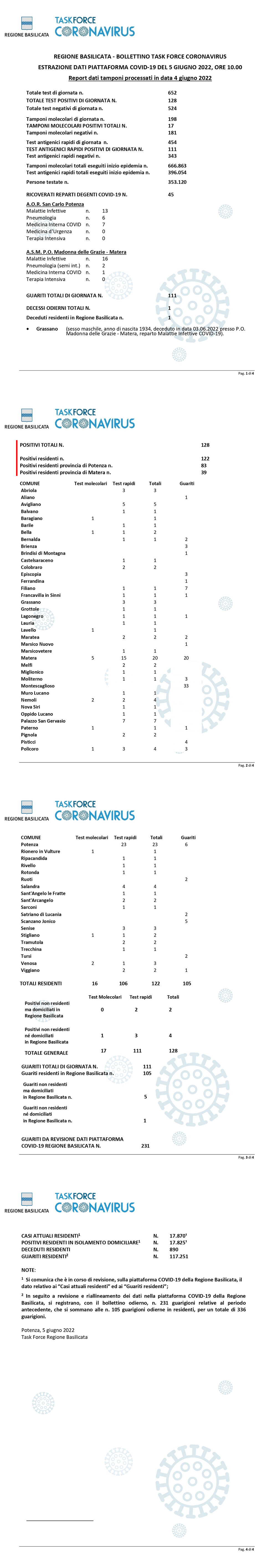 La task force regionale comunica che nella giornata di ieri 4 Giugno, sono stati processati 652 tamponi (molecolari ed antigenici) per la ricerca di contagio da Covid-19, di cui 128 sono risultati positivi.