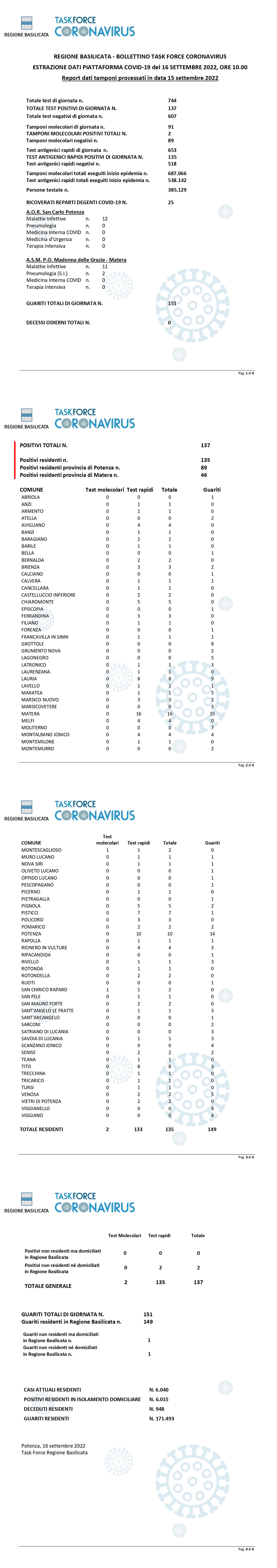 La task force regionale comunica che nella giornata di ieri 15 Settembre, sono stati processati 744 tamponi (molecolari ed antigenici) per la ricerca di contagio da Covid-19, di cui 137 sono risultati positivi.