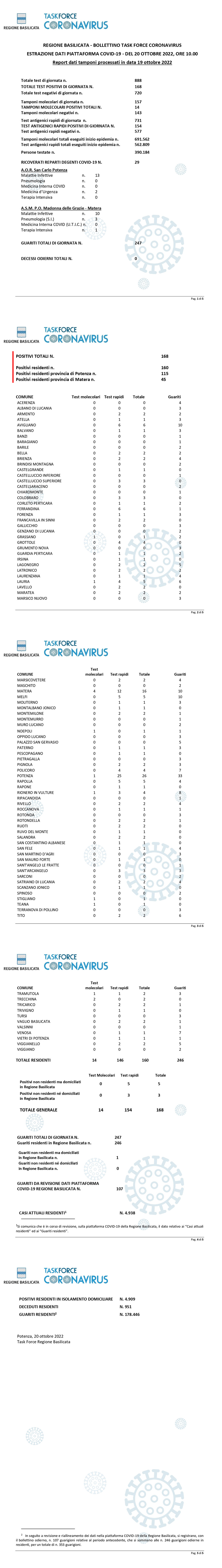 La task force regionale comunica che nella giornata di ieri 19 ottobre, sono stati processati 888 tamponi (molecolari ed antigenici) per la ricerca di contagio da Covid-19, di cui 168 sono risultati positivi.