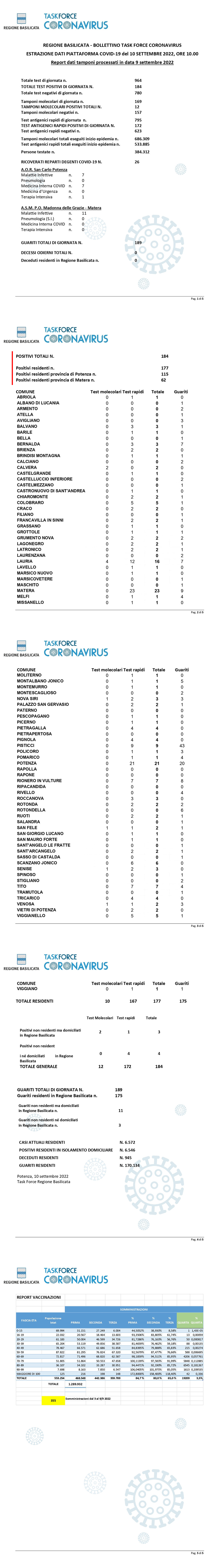 La task force regionale comunica che nella giornata di ieri 9 Settembre, sono stati processati 964 tamponi (molecolari ed antigenici) per la ricerca di contagio da Covid-19, di cui 184 sono risultati positivi.