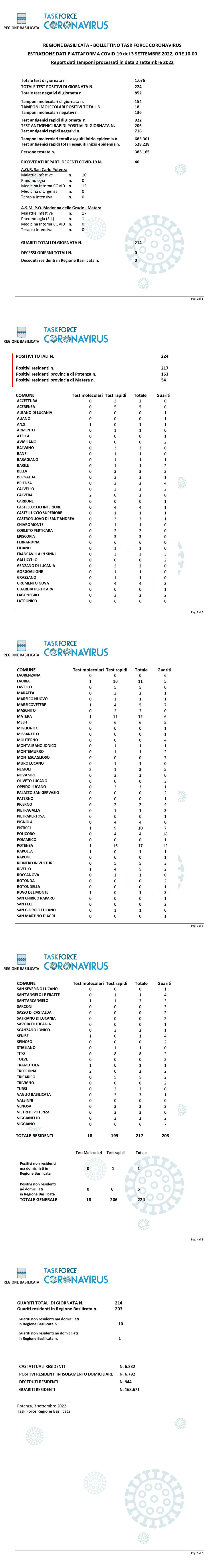 La task force regionale comunica che nella giornata di ieri 2 Settembre, sono stati processati 1.076 tamponi (molecolari ed antigenici) per la ricerca di contagio da Covid-19, di cui 224 sono risultati positivi.