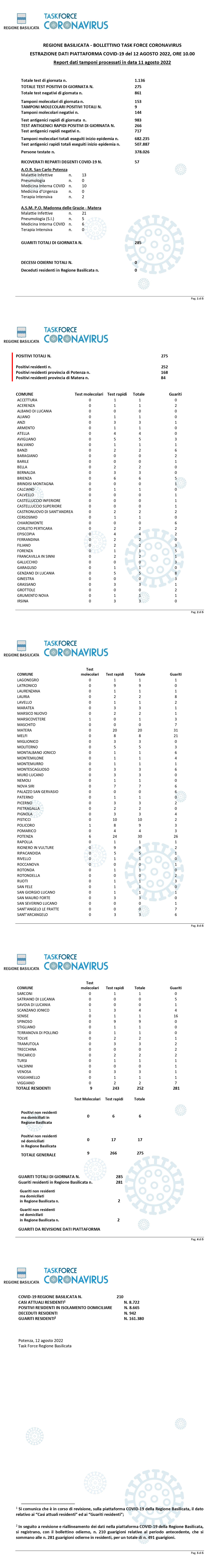 La task force regionale comunica che nella giornata di ieri 11 Agosto, sono stati processati 1.136 tamponi (molecolari ed antigenici) per la ricerca di contagio da Covid-19, di cui 275 sono risultati positivi.