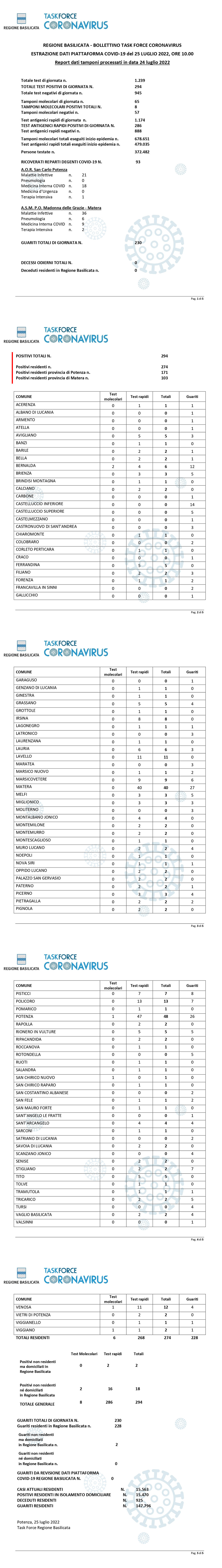 La task force regionale comunica che nella giornata di ieri 24 luglio, sono stati processati 1.239 tamponi (molecolari ed antigenici) per la ricerca di contagio da Covid-19, di cui 294 sono risultati positivi.