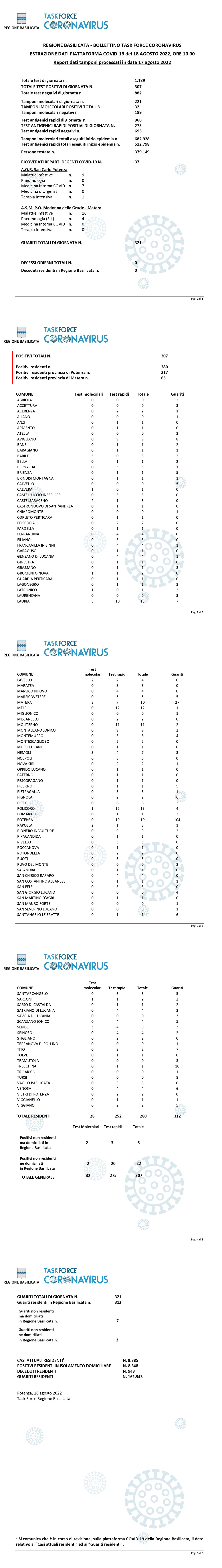 La task force regionale comunica che nella giornata di ieri 17 Agosto, sono stati processati 1.189 tamponi (molecolari ed antigenici) per la ricerca di contagio da Covid-19, di cui 307 sono risultati positivi.