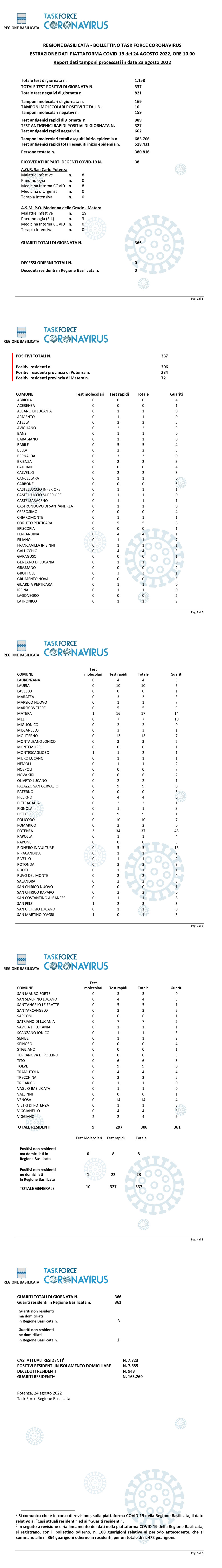 La task force regionale comunica che nella giornata di ieri 23 Agosto, sono stati processati 1.158 tamponi (molecolari ed antigenici) per la ricerca di contagio da Covid-19, di cui 337 sono risultati positivi.