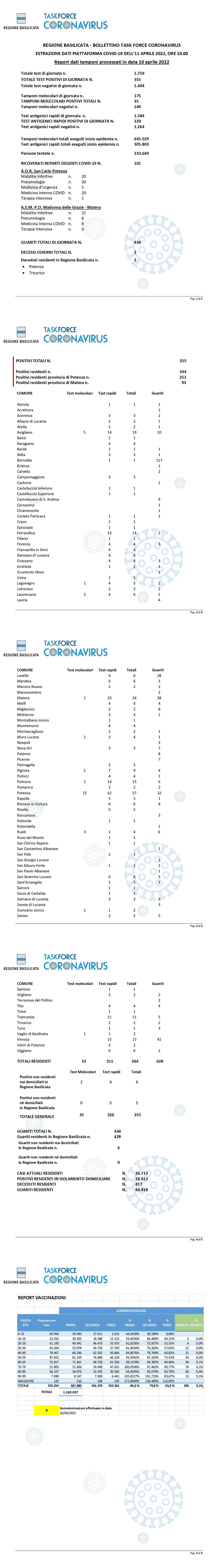La task force regionale comunica che nella giornata di ieri, 10 Aprile, sono stati processati 1.759 tamponi (molecolari ed antigenici) per la ricerca di contagio da Covid-19, di cui 355 sono risultati positivi.