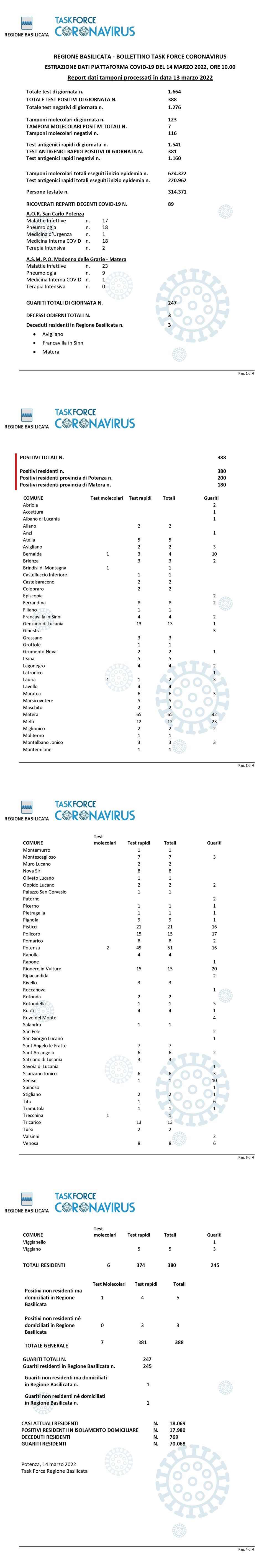 Sempre nella giornata di ieri, sono stati processati 1.664 tamponi (molecolari ed antigenici) per la ricerca di contagio da Covid-19, di cui 388 sono risultati positivi.