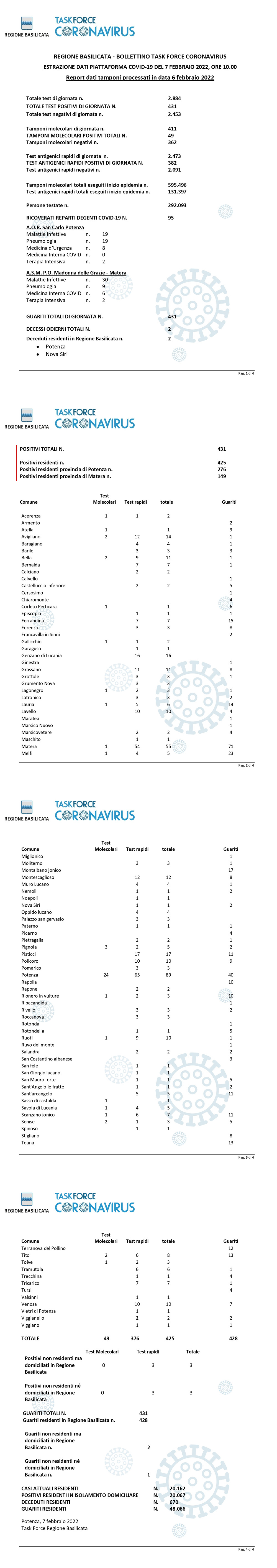 sono stati processati 2.884 tamponi (molecolari ed antigenici) per la ricerca di contagio da Covid-19, di cui 431 sono risultati positivi (425 riguardano residenti in Basilicata).