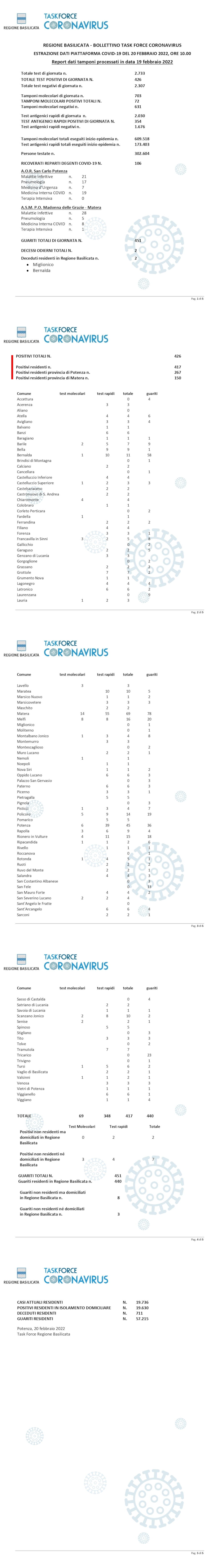 La Task Froce regionale comunica che ieri, 19 febbraio, sono stati processati 2733 tamponi di cui 426 sono risultati positivi.