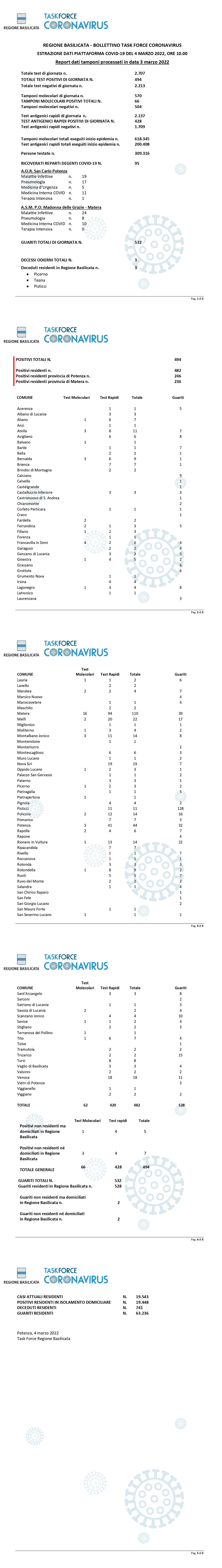 La task force regionale comunica che nella giornata di ieri, 3 marzo, sono stati processati 2.707 tamponi (molecolari ed antigenici) per la ricerca di contagio da Covid-19, di cui 494 sono risultati positivi.