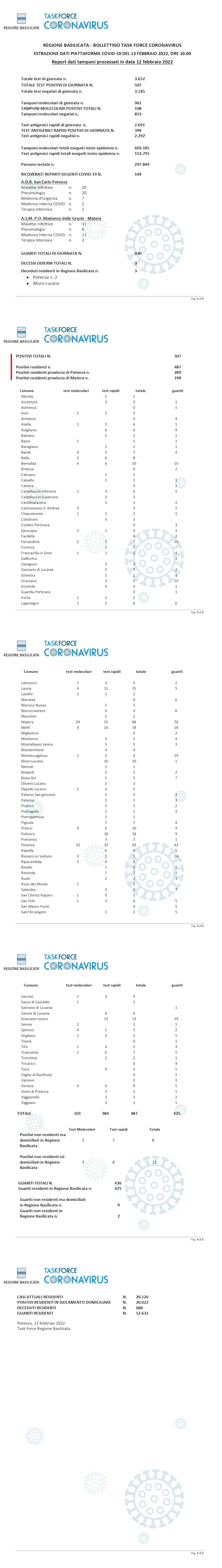 Questi i dati, relativi alla giornata di ieri, 12 Febbraio, comunicati dalla task force regionale: