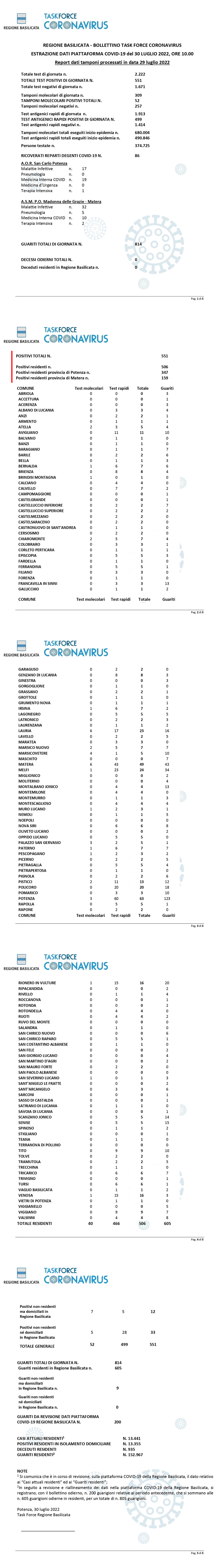 La task force regionale comunica che nella giornata di ieri 29 Luglio, sono stati processati 2.222 tamponi (molecolari ed antigenici) per la ricerca di contagio da Covid-19, di cui 551 sono risultati positivi.