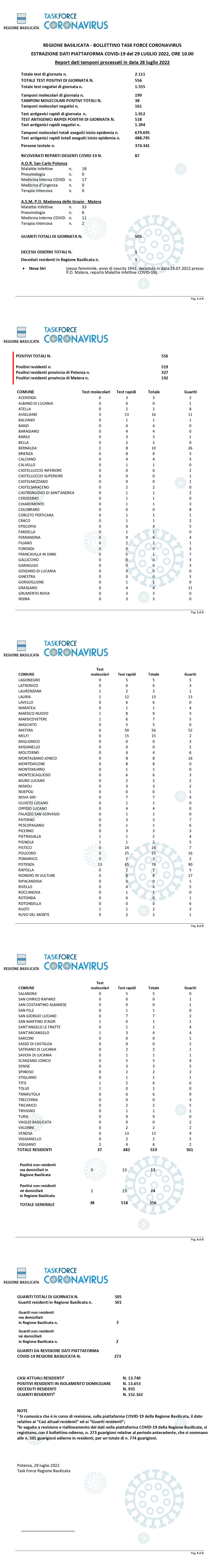 La task force regionale comunica che nella giornata di ieri 28 Luglio, sono stati processati 2.111 tamponi (molecolari ed antigenici) per la ricerca di contagio da Covid-19, di cui 556 sono risultati positivi.
