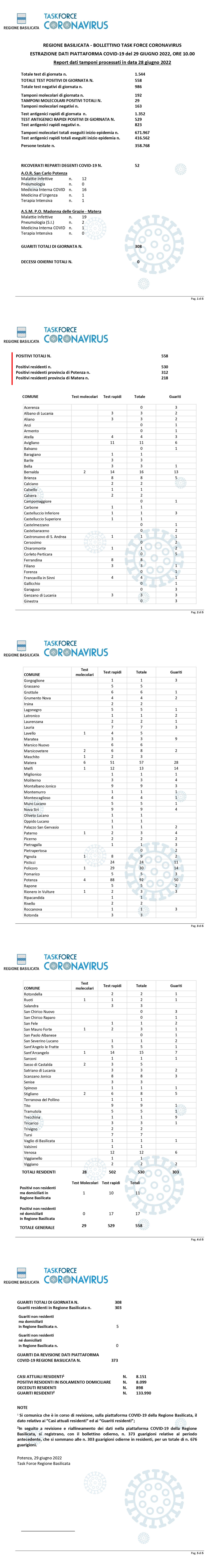 La task force regionale comunica che nella giornata di ieri 28 Giugno, sono stati processati 1544 tamponi (molecolari ed antigenici) per la ricerca di contagio da Covid-19, di cui 558 sono risultati positivi.