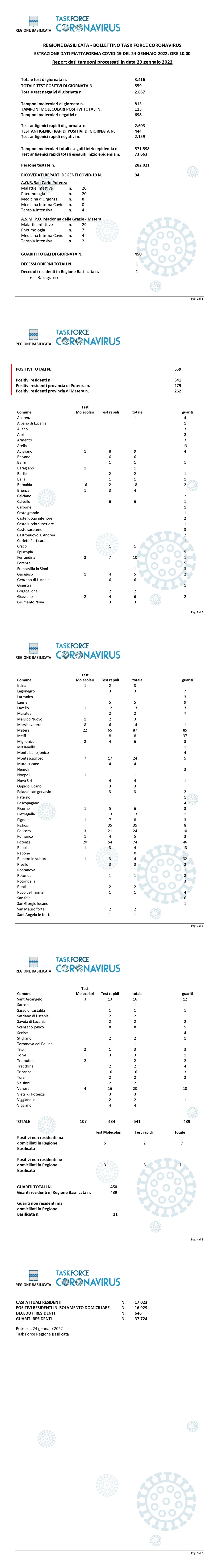 La task force regionale comunica che nella giornata di ieri, 23 gennaio, sono stati processati 3.416 tamponi (molecolari ed antigenici) per la ricerca di contagio da Covid-19, di cui 559 sono risultati positivi.