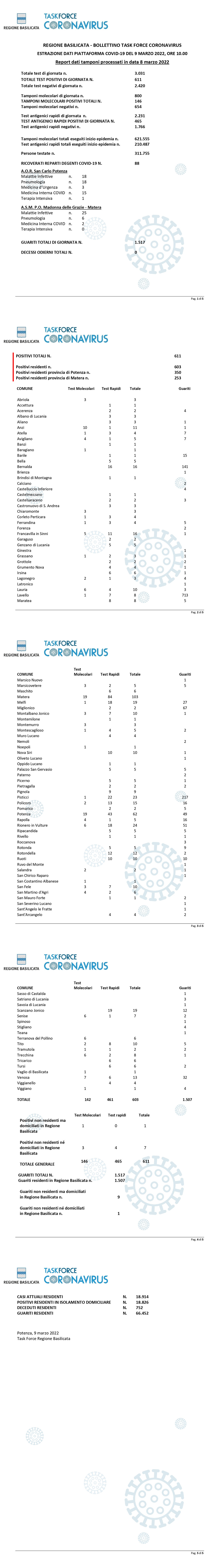 La task force regionale comunica che nella giornata di ieri, 8 marzo, sono stati processati 3.031 tamponi (molecolari ed antigenici) per la ricerca di contagio da Covid-19, di cui 611 sono risultati positivi.