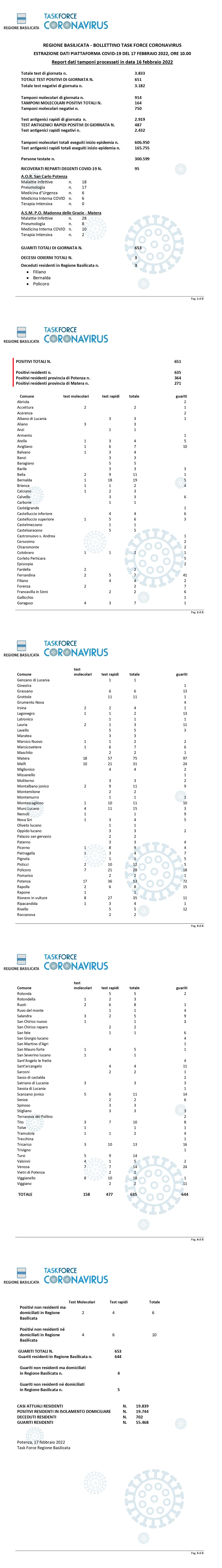 La task force regionale comunica che nella giornata di ieri, 16 febbraio, sono stati processati 3.833 tamponi (molecolari ed antigenici) per la ricerca di contagio da Covid-19, di cui 651 sono risultati positivi.