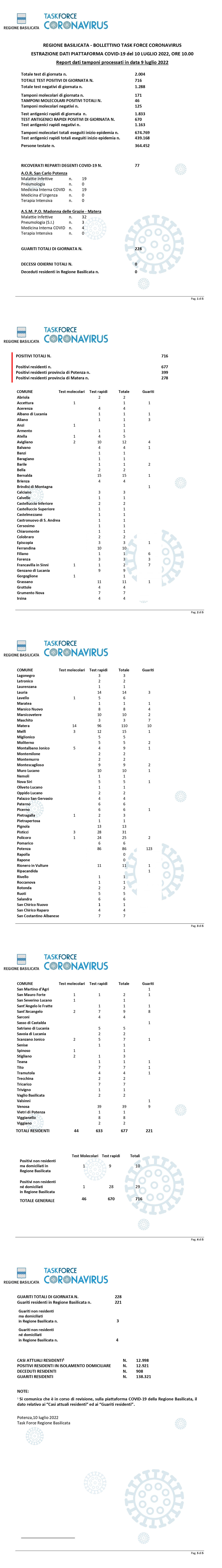 La task force regionale comunica che nella giornata di ieri 9 luglio, sono stati processati 2.004 tamponi (molecolari ed antigenici) per la ricerca di contagio da Covid-19, di cui 716 sono risultati positivi.