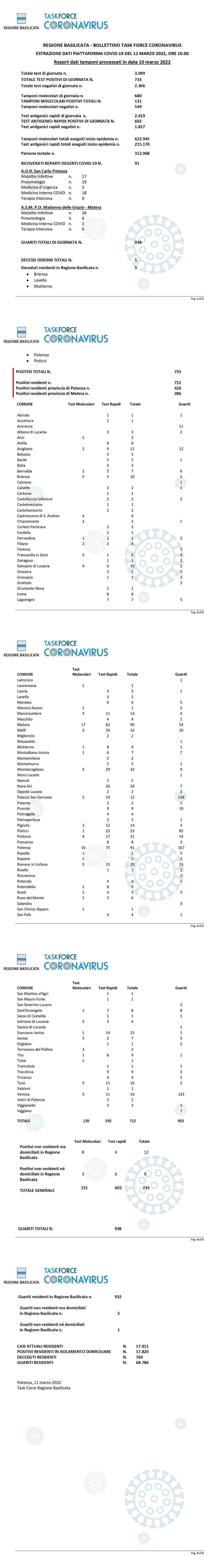 La task force regionale comunica che nella giornata di ieri, 10 Marzo, sono stati processati 3.099 tamponi (molecolari ed antigenici) per la ricerca di contagio da Covid-19, di cui 733 sono risultati positivi.