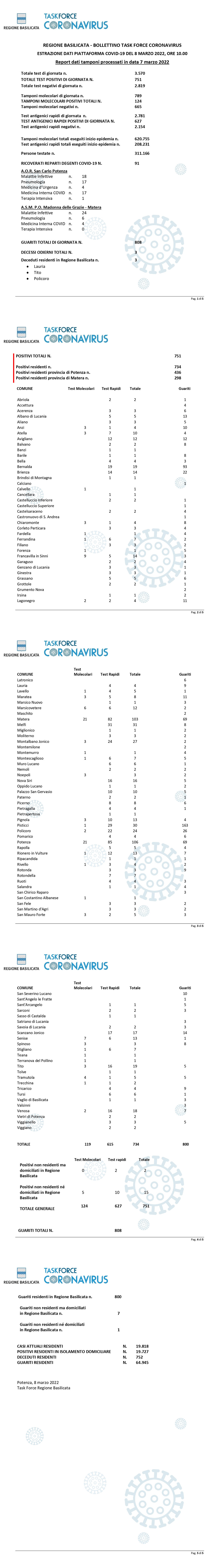 La task force regionale comunica che nella giornata di ieri, 7 marzo, sono stati processati 3.570 tamponi (molecolari ed antigenici) per la ricerca di contagio da Covid-19, di cui 751 sono risultati positivi.