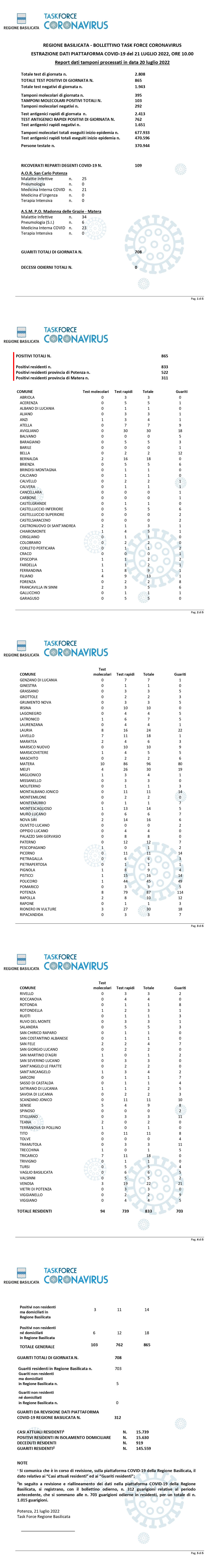 La task force regionale comunica che nella giornata di ieri 20 luglio, sono stati processati 2.808 tamponi (molecolari ed antigenici) per la ricerca di contagio da Covid-19, di cui 865 sono risultati positivi.