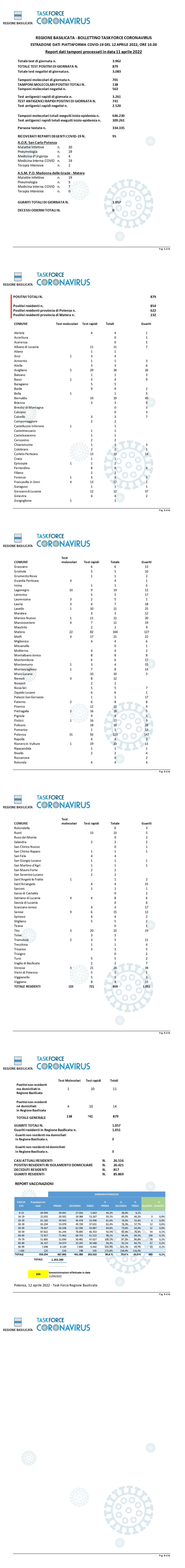 La task force regionale comunica che nella giornata di ieri, 11 Aprile, sono stati processati 3.962 tamponi (molecolari ed antigenici) per la ricerca di contagio da Covid-19, di cui 879 sono risultati positivi.
