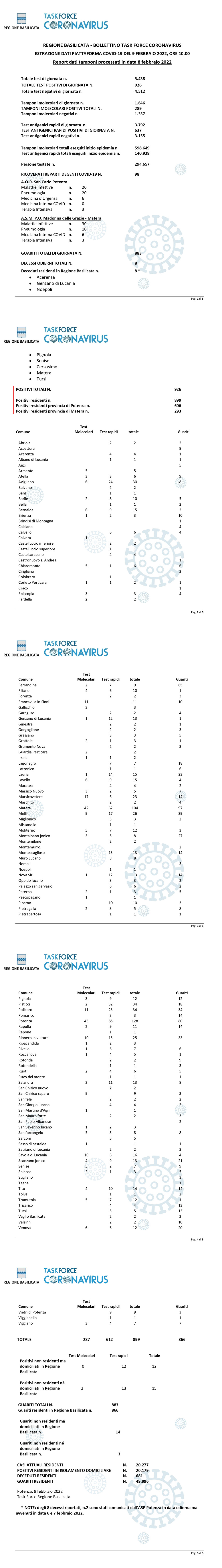 La task force regionale comunica che nella giornata di ieri, 8 febbraio, sono stati processati 5.438 tamponi (molecolari ed antigenici) per la ricerca di contagio da Covid-19, di cui 926 sono risultati positivi (899 sono i lucani).