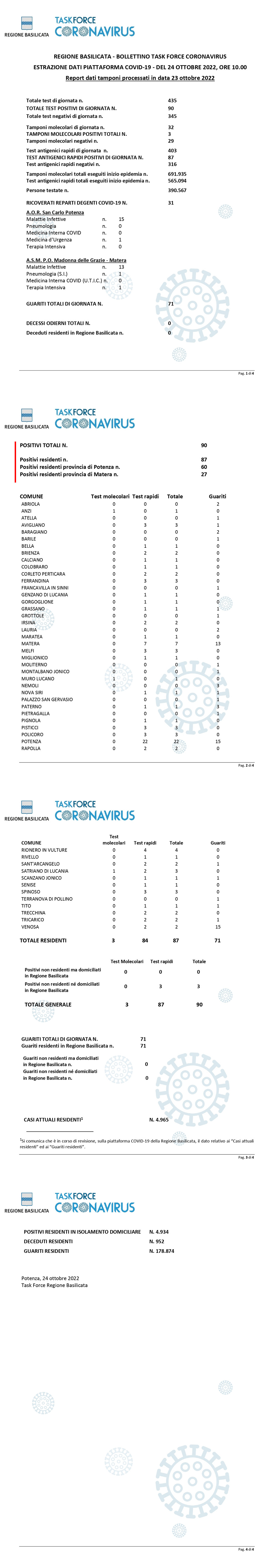 La task force regionale comunica che nella giornata di ieri 23 ottobre, sono stati processati 435 tamponi (molecolari ed antigenici) per la ricerca di contagio da Covid-19, di cui 90 sono risultati positivi.