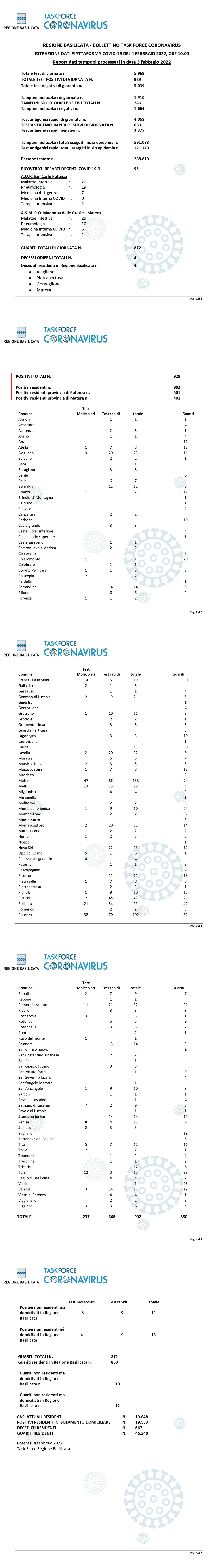 La task force regionale comunica che nella giornata di ieri, 3 febbraio, sono stati processati 5.968 tamponi (molecolari ed antigenici) per la ricerca di contagio da Covid-19, di cui 929 sono risultati positivi.