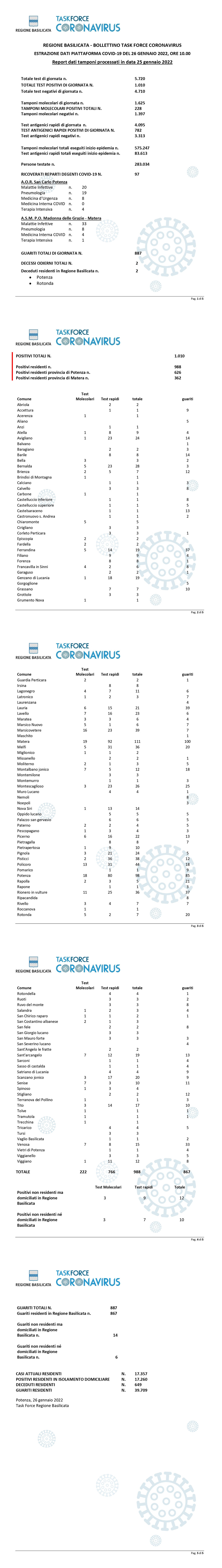 Nella giornata di ieri, sono stati processati 5.720 tamponi (molecolari ed antigenici) per la ricerca di contagio da Covid-19, di cui 1.010 sono risultati positivi.