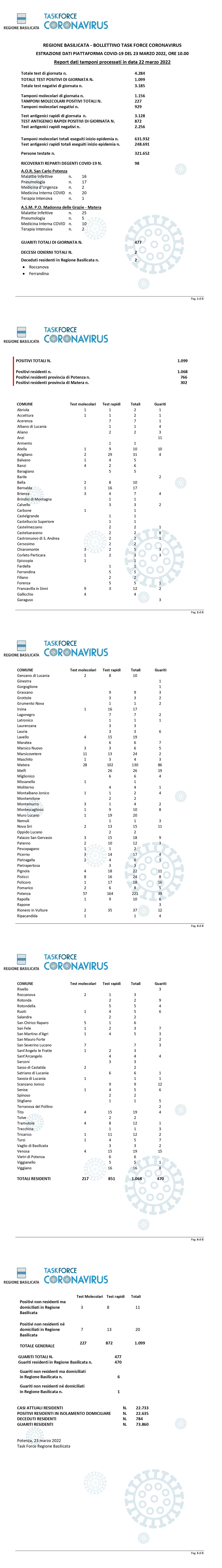 La task force regionale comunica che nella giornata del 22 marzo, sono stati processati 4.284 tamponi (molecolari ed antigenici) per la ricerca di contagio da Covid-19, di cui 1.099 sono risultati positivi.