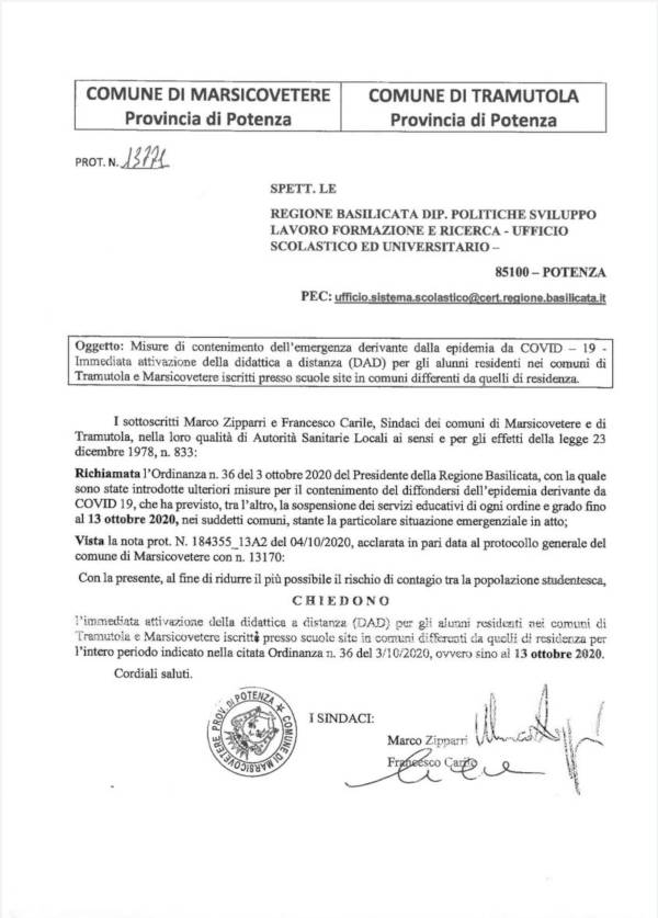 “Pubblichiamo la richiesta inviata, a firma congiunta del Sindaco di Tramutola, Francesco Carile e del Sindaco di Marsicovetere Marco Zipparri, alla Regione Basilicata per l’attivazione della DAD (Didattica a distanza) per tutti gli alunni residenti nei due comuni ma iscritti in differenti paesi, per tutto il tempo indicato nell’ordinanza n.36 del 03 Ottobre 2020 del Presidente della Regione Vito Bardi.
