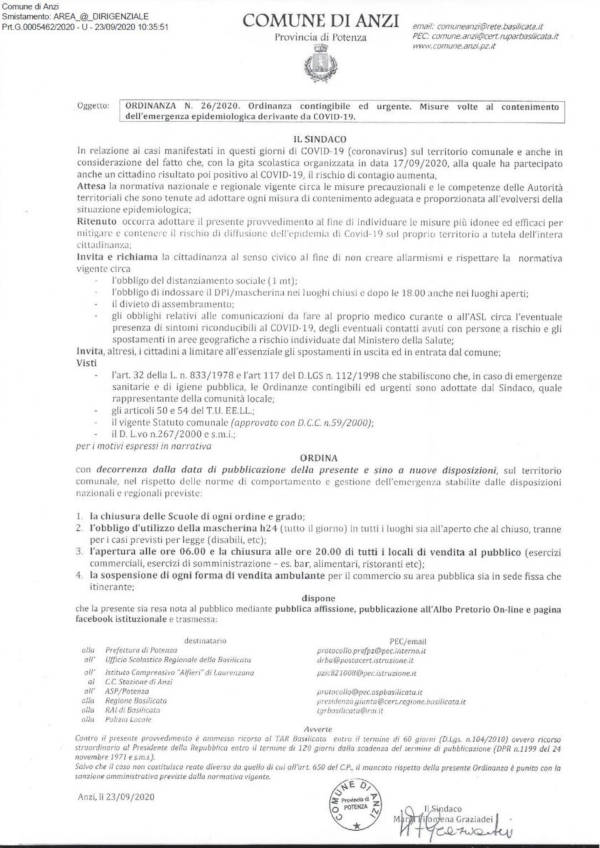 Comunico, giusta Ordinanza sindacale n. 26 del 23 settembre 2020 decorrente da oggi e fino a nuova disposizione: