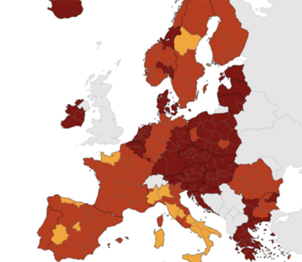 Nella mappa europea dei contagi elaborata dall’Ecdc nessuna regione in Europa è più a basso rischio, colorato in verde.