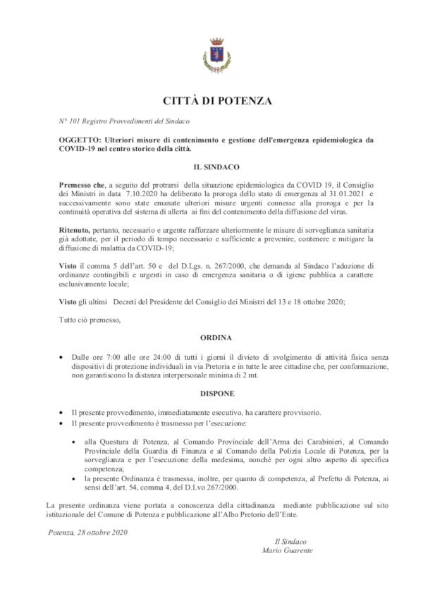 “Divieto di svolgimento di attività fisica senza dispositivi di protezione individuali in via Pretoria e in tutte le aree cittadine che, per conformazione, non garantiscono la distanza interpersonale minima di 2 mt dalle ore 7:00 alle ore 24:00 di tutti i giorni“.