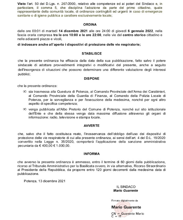 Con proprio provvedimento, il sindaco di Potenza Mario Guarente impone, dalle ore 00:01 di martedì 14 dicembre 2021 alle ore 24:00 di giovedì 6 gennaio 2022, nella fascia oraria compresa tra le ore 10:00 e le ore 22:00, nelle vie del centro storico cittadino e nelle adiacenti piazze e vicoli, di indossare anche all’aperto i dispositivi di protezione delle vie respiratorie.