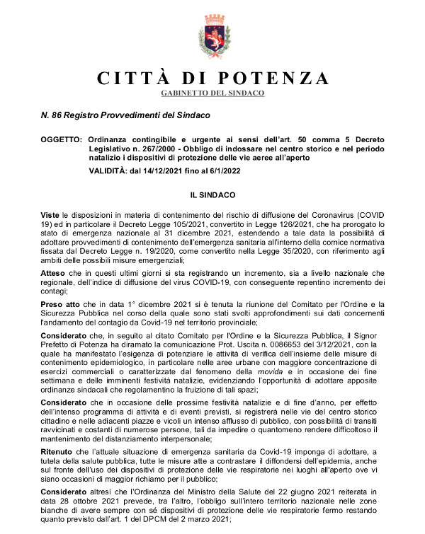 Con proprio provvedimento, il sindaco di Potenza Mario Guarente impone, dalle ore 00:01 di martedì 14 dicembre 2021 alle ore 24:00 di giovedì 6 gennaio 2022, nella fascia oraria compresa tra le ore 10:00 e le ore 22:00, nelle vie del centro storico cittadino e nelle adiacenti piazze e vicoli, di indossare anche all’aperto i dispositivi di protezione delle vie respiratorie.