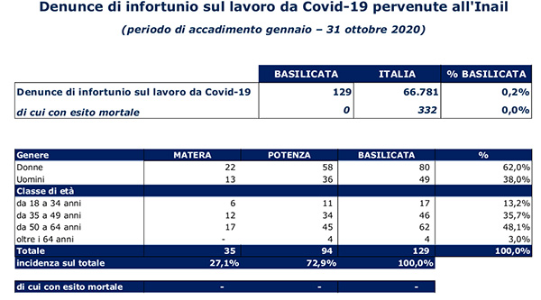 Anche la Basilicata ha registrato in Ottobre un notevole incremento delle denunce di infortunio da Covid 19 con ben 56 casi nel mese considerato rispetto ai 73 casi annoverati alla data al 30 Settembre 2020 (con un balzo del 76,71%).