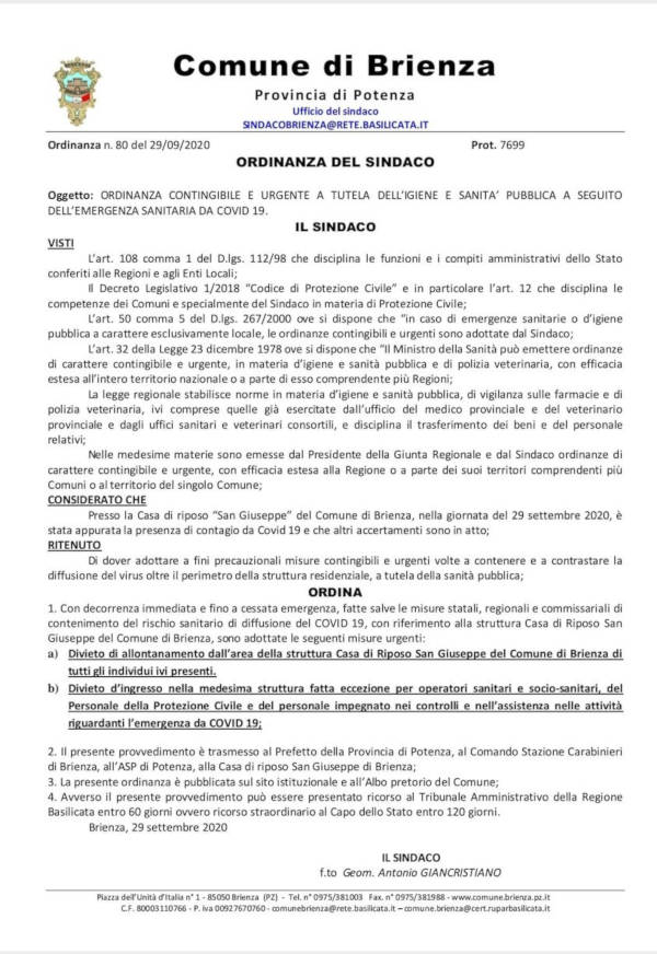 Presso la Casa di riposo ‘San Giuseppe’ del Comune di Brienza, nella giornata del 29 settembre 2020, è stata appurata la presenza di contagio da Covid 19 e che altri accertamenti sono in atto;