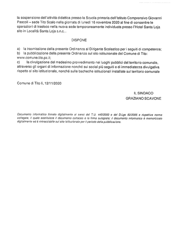 Considerato che si rende necessario procedere al trasloco presso la nuova sede individuata temporaneamente in località Santa Loja e dato atto che le operazioni di trasloco sono state previste per Lunedì 16 Novembre così da consentire la ripresa delle attività scolastiche presso la nuova sede temporanea da Mercoledì 18 Novembre, si ordina la sospensione dell’attività didattica presso la scuola primaria dell’Istituto comprensivo Giovanni Pascoli sede Tito scalo nella giornata di Lunedì 16 Novembre 2020 al fine di consentire le operazioni di trasloco nella nuova sede temporaneamente individuata presso l’Hotel Santa Loja sito in località Santa Loja snc“.