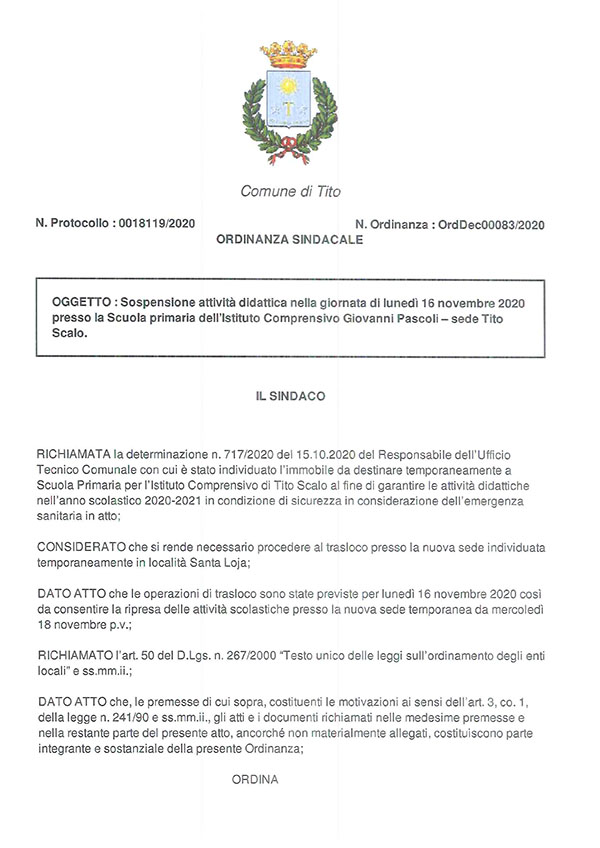 Considerato che si rende necessario procedere al trasloco presso la nuova sede individuata temporaneamente in località Santa Loja e dato atto che le operazioni di trasloco sono state previste per Lunedì 16 Novembre così da consentire la ripresa delle attività scolastiche presso la nuova sede temporanea da Mercoledì 18 Novembre, si ordina la sospensione dell’attività didattica presso la scuola primaria dell’Istituto comprensivo Giovanni Pascoli sede Tito scalo nella giornata di Lunedì 16 Novembre 2020 al fine di consentire le operazioni di trasloco nella nuova sede temporaneamente individuata presso l’Hotel Santa Loja sito in località Santa Loja snc“.