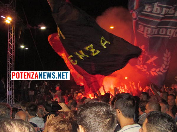Centinaia di tifosi potentini hanno accolto in Piazza Don Pinuccio Lattuchella (nel rione Poggio Tre Galli) gli 11 Leoni Rossblu, che a partire dalle ore 19:30 si sono presentati tra cori, tifo e applausi.