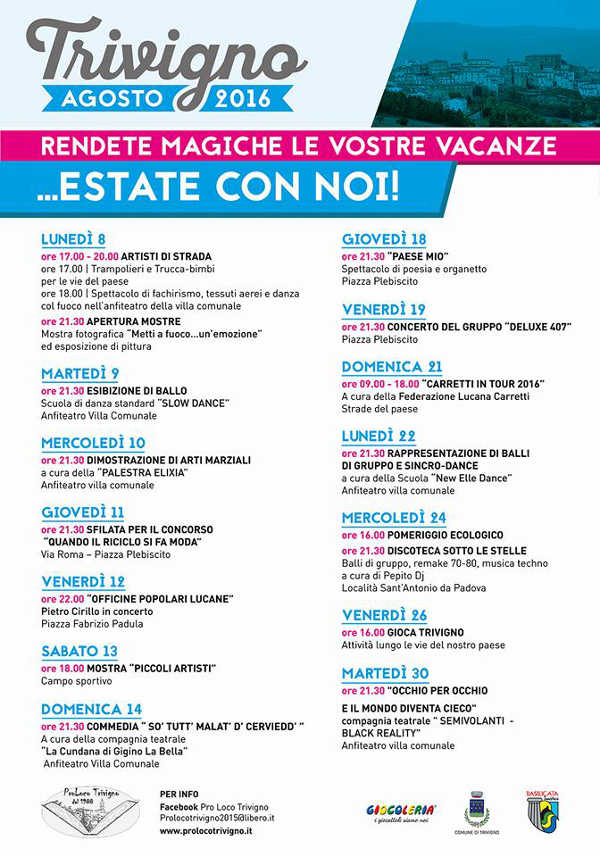 Le iniziative contenute nel cartellone estivo sono in continuità con le proposte che già da mesi la Pro Loco offre alla comunità locale e ai comuni limitrofi, anche in virtù della nascita dell’Unione dei Comuni e delle Pro Loco Val Camastra Basento che persegue un progetto con una visione unitaria e strategica che ha come obiettivo un nuovo e maggior sviluppo delle risorse dell’area della circoscrizione, pur mantenendo vive le radici delle antiche tradizioni.