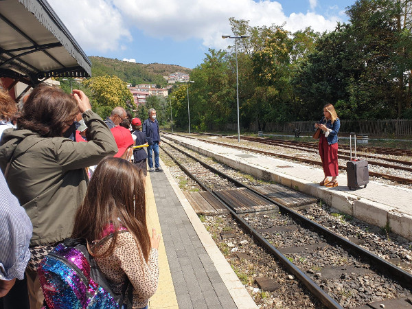 All’arrivo, nella sala d’aspetto della stazione ferroviaria di Avigliano si è tenuto un breve spettacolo teatrale, con protagonista un migrante lucano degli anni ’50 e a seguire la proiezione di un breve filmato sui treni.