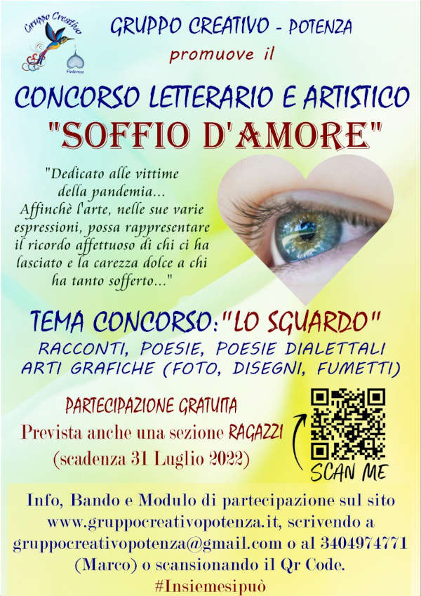 “È stato diffuso il 14 Maggio il Bando per la Partecipazione al Concorso Letterario e Artistico “Soffio d’Amore”, con tema “Lo sguardo” e dedicato alle vittime della pandemia e ai loro cari.