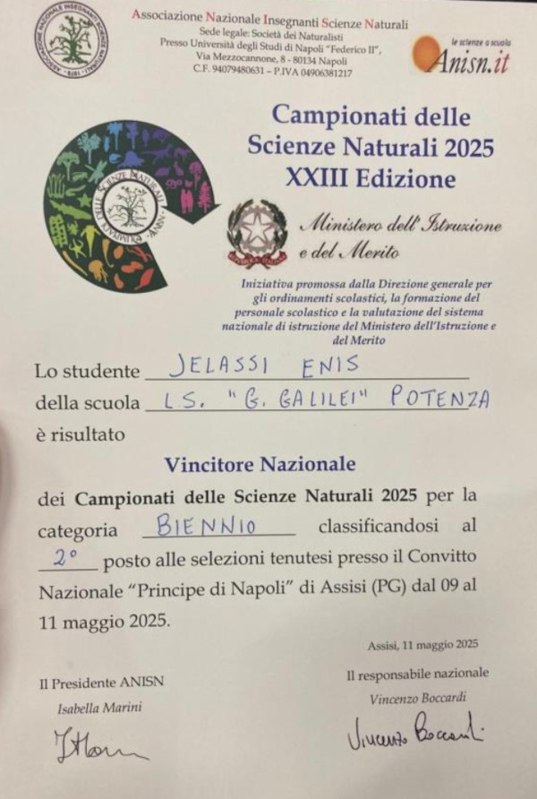 Il Liceo G. Galilei, tra le 11 scuole partecipanti al progetto delle Scienze Naturali della Regione Basilicata e tra le 435 scuole distribuite sull’intero territorio nazionale e di due scuole italiane all’estero (scuole del Belgio), si distingue e vince.