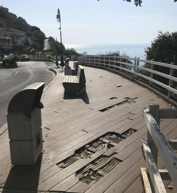 Le immagini parlano chiaro: il famoso Belvedere, sito nella piazzetta di Pietra del sole, appare ormai compromesso esteticamente e strutturalmente; il marciapiede nei pressi dei Cappuccini appare rattoppato alla buona mediante l’ausilio di lamiere.