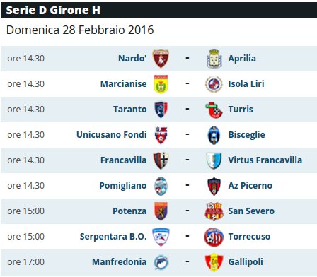 Ecco di seguito tutte le partite della 26esima giornata della serie D girone H e la classifica.