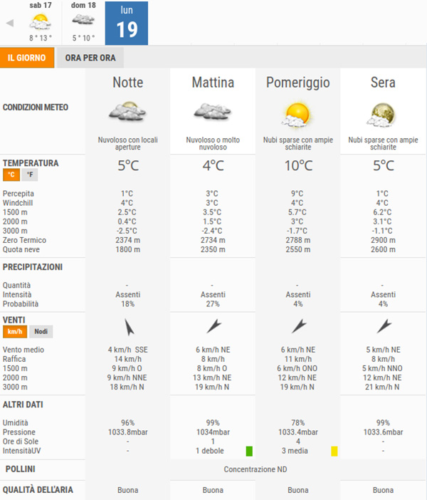 Lunedì 19 Dicembre avremo giornata in prevalenza poco nuvolosa, salvo presenza di nubi sparse al mattino, non sono previste piogge.