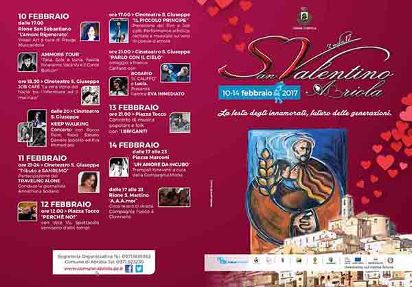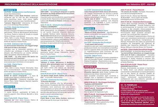 Dalle 17:00 alle 24:00 – Cineteatro San Giuseppe, lancio della seconda edizione di “aBRIOla Street Art Festival” – Evento Pubblico con religiose e cittadini. Convocazione del Protocollo di Intesa Basilicata Creativa Premiazione degli studenti vincitori del premio “Un cuore per San Valentino”.